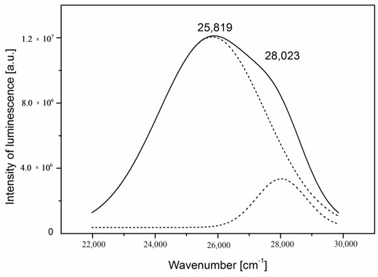 On the excitation spectra, two bands at 284 nm and 321 nm were recorded, so the crystal-field splitting 10 Dq of 5d level was estimated as 4059 cm−1. The upper excited level of Ce3+ is T2g and the lower is Eg. The 10 Dq parameter for Ce3+ usually has a value in the 5000–10,000 cm−1 range. For the studied crystal it was slightly smaller because the Ca–O length in agrellite is larger than in other Ca–minerals, for example fluor-apatite. The emission band of Ce3+ is nearly symmetric, although it was fitted to two Gaussian components with maxima at 28,023 cm−1 and 25,819 cm−1 (R2 = 0.998) that can be discerned, (Figure 8), which correspond to the transition terminated on the 2F5/2 and 2F7/2 levels.