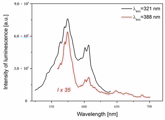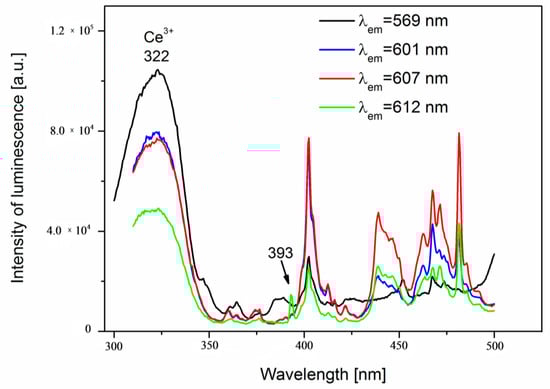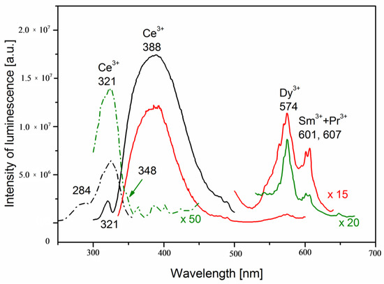 Under excitation λexc = 321 nm, not only the emission of Dy3+ (574 nm) but also of Sm3+ and Pr3+ (562 nm, 569 nm, 601 nm, 607 nm), was measured (Figure 9). On the excitation spectra monitored at 562 nm, not only the most convenient bands for Sm3+ (and Pr3+) were measured but an intense band of Ce3+ was recorded too. In the excitation spectra of Sm3+, Pr3+, and Eu3+, the Ce3+ band at 321–323 nm always appeared and it was intense. (Figure 13). This same effect has been measured when luminescence was excited into the Ce3+ emission band, i.e., 388 nm (Figure 14).