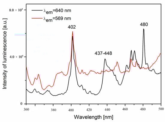 The efficient emission of Sm3+ and Pr3+ was also found for agrellite crystal. In the spectral range of 550–700 nm, the emission lines of these two ions are located close to each other and are: at 562 nm and 569 nm as 4G5/2 → 6H5/2 transition of Sm3+; at 601 nm and 607 nm of both Sm3+ 4G5/2 → 6H7/2 and Pr3+ 1D2 → 3H4 + 3P0 → 3H6 transitions; and at 648 nm mainly for Pr3+ transition 3P0 → 3F2. As it was found earlier [9], the most convenient excitation for Sm3+ is the 399-402 nm line, while for Pr3+ it is 480 nm (Figure 10).
