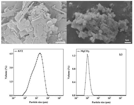 SEM micrographies (a) KT2 and (b) magnesite, and particle size distribution (c) of the raw materials.