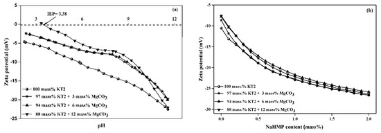 Usually, the stability and homogeneity of slurries mainly depend on the zeta potential value of particles, since it is correlated with particle surface charge. Then, the flocculation or dispersion phenomenon within slurries may vary with zeta potential evolution, as indicated in previous studies [34,35]. This behavior attributed to the adsorption of H+ and OH− ions onto the surface of the particles. However, it can be seen from the data presented in Figure 4a that the zeta potential values of KT2 slurries, regardless of the MgCO3 content, became more negative with increasing pH values from 2 to 12.