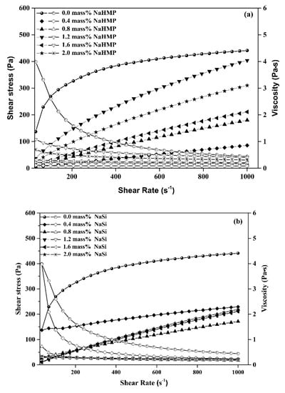 In general, the phyllosilicate suspensions stabilization depends on the concentration and charge density of dispersants as well as the specific interactions with clay platelets. The NaHMP and NaSi dispersants used in the present study are adsorbed onto the surface of KT2 particles, inducing electrostatic repulsive forces between the particles, which consequently affect the rheological behavior of the corresponding slurries. In order to determine the optimum dispersants content, the shear stress and the viscosity of each slurry were investigated as a function of the shear rate for different dispersant contents (NaSi and NaHMP from 0.4 to 2 mass%; see Figure 5a,b). The flow curves were analyzed and fitted to the Herschel–Bulkley (H-B) model expressed by Equation (9), since it was the best model (compared to the Bingham and the Oswald de Waele models) in agreement with the associated high correlation coefficients R2 (0.96 < R2 < 0.99).