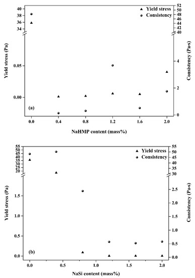 It can be observed from the evolution of consistency and yield stress shown in Figure 6, that the optimal dispersant content for NaHMP (Figure 6a) and NaSi (Figure 6b) are 0.4 and 1.2 mass%, respectively. However, the consistency (K) values decrease when adding the dispersants down to a minimum value, which corresponds to the optimal concentration of dispersants (0.4 and 1.2 mass% optimal amount of NaHMP and SiNa, respectively). Further increases of dispersant above these optimized values leads to an increase of consistency, which is mainly due to the ions adsorption saturation of the clay particles.