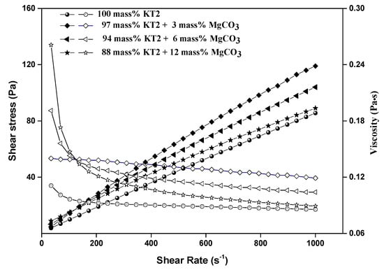 The results of Landrou et al. [23] provided that MgO acts as an anti-dispersant for deflocculated kaolin slurries by stopping the activity of the NaHMP dispersant. However, many studies indicated that magnesite and magnesium hydroxide are usually calcined to produce MgO [42,43]. Thus, in this study, various MgCO3 amounts were introduced into the mixed KT2/dispersants in order to study their effects on the rheological behavior of dispersed slurries with an optimal amount of NaSi or NaHMP dispersants. Regardless of the dispersant used, it was observed that the viscosity of dispersed slurries increases with increasing MgCO3 content (3, 6, and 12 mass%). The results obtained with NaHMP are presented in Figure 7. The same trend was obtained with suspensions dispersed using the optimal amount of NaSi.