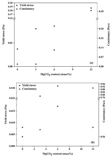 Yield stress and consistency of KT2/MgCO3 mixtures with (a) 0.4 mass% NaHMP and (b) 1.2 mass% NaSi.