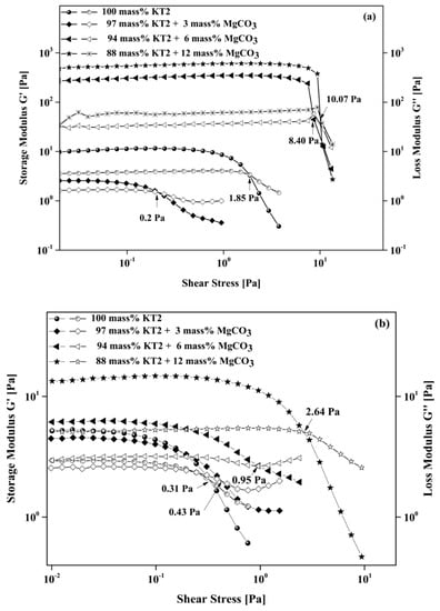 Stress sweep test at 10 s−1 of KT2 and MgCO3 mixtures dispersed with (a) 0.4 mass% of NaHMP and (b) 1.2 mass% of NaSi dispersants.