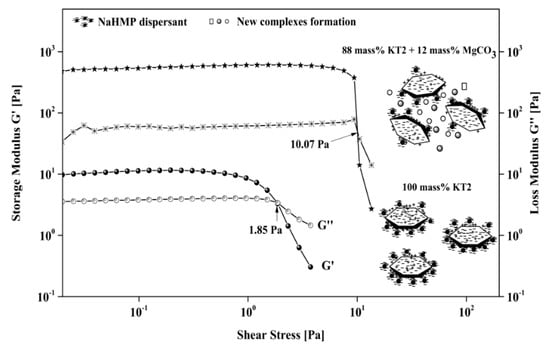 Consequently, the crossover point between G′ and G″ separates these two regions. Beyond this point, the rupture of the three-dimensional structure or the complex formed by the particles may occur. The results showed that at low oscillation stress, both moduli remained almost constant, and G′ was greater than G″ in the presence of each dispersant (NaHMP or NaSi). This result indicates that the suspensions behave in a more elastic than viscous manner since the small shear stress oscillation demanded minor structure deformation. The values of G′ and G″ were both constant up to a crossover point, and below this critical point, the system behaved in a linear viscoelastic manner (shear stress <0.1 Pa). When the shear stress increased above the crossover point, the viscous modulus dominated the elastic modulus and the system exhibited in a non-linear viscoelastic behavior (shear stress values >0.1 Pa). In this region, the storage modulus shows a drastic drop due to the breakdown of the weak attractive forces between the particles by the external shear stress, which destroys the internal structure. In addition, the crossover point increased significantly when the amount of MgCO3 > 3 mass%. Without MgCO3, it is at 1.85 and 0.31 Pa for dispersed suspensions with an optimal amount of NaHMP and NaSi, respectively. However, at 6 and 12 mass% of added MgCO3, the crossover point was equal to 8.4 and 10.06 for dispersed suspensions with NaHMP and 0.95 and 2.64 Pa for dispersed suspensions with NaSi. Figure 10 illustrates the differences in LVER with and without magnesite and the related particle arrangements within the suspensions.