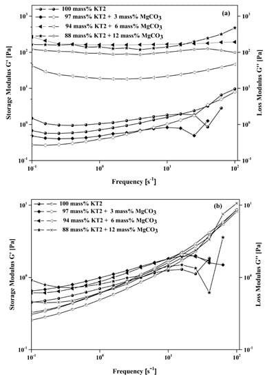 The frequency sweep tests for various KT2/MgCO3 mixture dispersions consist of measuring the evolution of both moduli as a function of frequency in the range 0.1 to 100 s−1 and fixing the stress at values belonging to the linear viscoelasticity domain (0.1 Pa). The frequency sweeps allowed determination and investigation of the structuring mechanisms present in a fluid at relaxation time. Therefore, in this domain, the rheological properties are not strain- or stress-dependents. The frequency sweep analysis of slurries was plotted (Figure 11) without and with magnesite (0, 3, 6, and 12 mass%), which were dispersed with an optimal amount of dispersant (0.4 mass% NaHMP or 1.2 mass% NaSi).