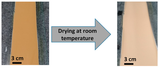 Photograph of KT2/MgCO3 green tapes (6 mass% of MgCO3) before and after drying at room temperature.