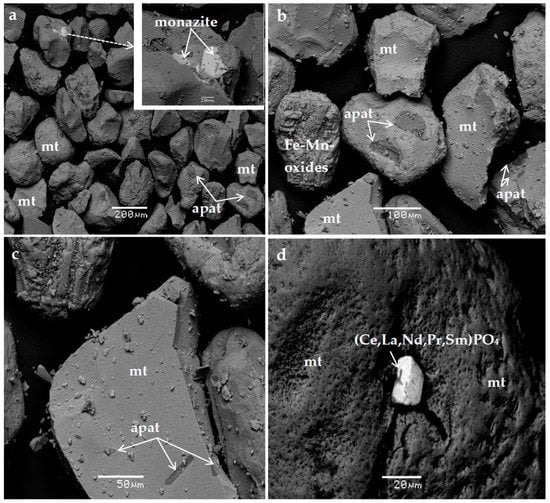 - Schock, H.H. Distribution of rare-earth and other trace elements in magnetite separates. Chem. Geol. 1979, 26, 119–133. [Google Scholar] [CrossRef]
