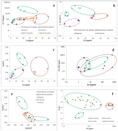 - Magnetite separates of hydrothermal origin associated with calc-alkaline rocks can be distinguished from that associated with ophiolites in terms of their higher Ga content, while magnetite separates of magmatic origin are characterized by the highest (V + Ti) content.