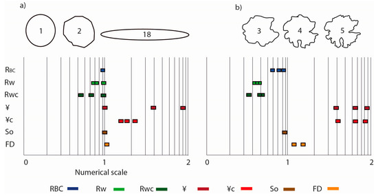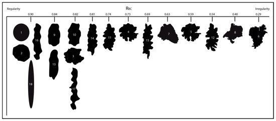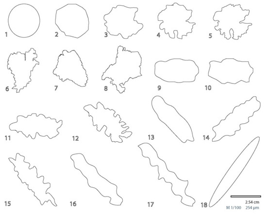 - Takashimizu, Y.; Iiyoshi, M. New parameter of roundness R: Circularity corrected by aspect ratio. Prog. Earth Planet. Sci. 2016, 3, 1–16. [Google Scholar] [CrossRef]