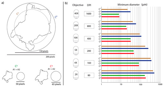 | Objective | Camera Lenses | Total | Geometric Calibration µm/pixel | Minimum Ø (µm) Case a | Minimum Ø (µm) Case b |