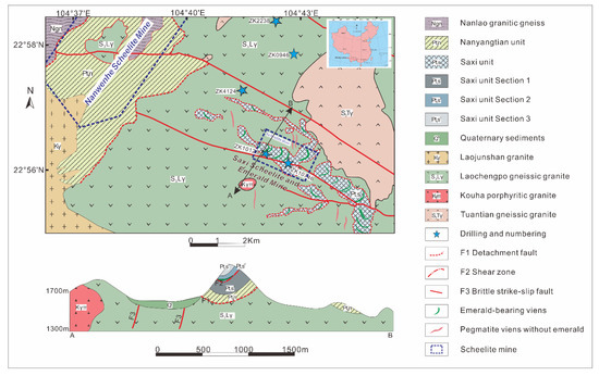 Simplified regional geologic map of Dayakou emerald occurrence modified after [24,29]. The structural profile map (A to B) indicates the tectonic layering in the area.