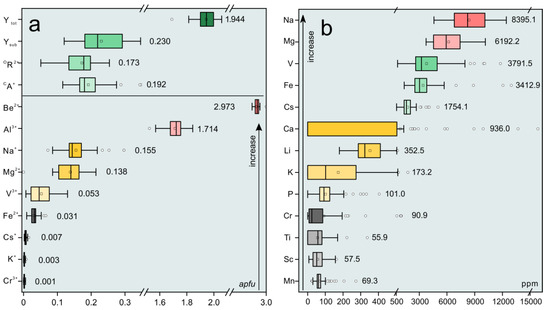 Compositional variations of trace elements in sample YE-6 are shown in Figure 13c. Most of the elements show stable content in the greenish-white core zone, excluding V. However, from the core to rim, remarkable variations are observed. The contents of Fe (1375 to 2198 ppm), Ga (4 to 14.7 ppm), Rb (9.6 to 27.4 ppm), and Cs (535 to 3108 ppm) increase considerably. The contents of V (970 to 10,077 ppm) show a continuous increase from the center to edge and are constantly higher than the contents of Fe and Cr.