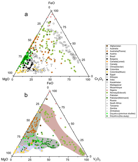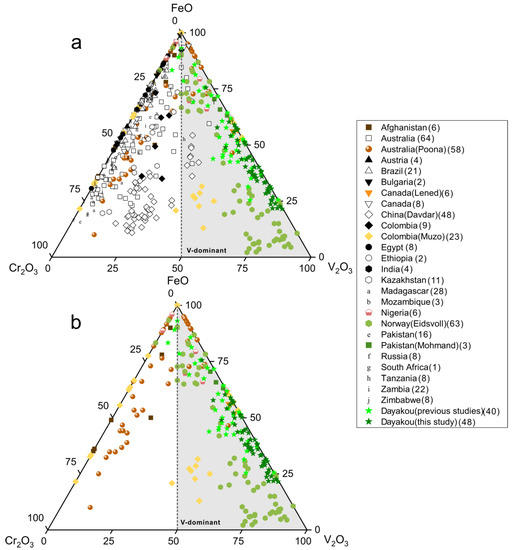Ternary FeO-Cr2O3-V2O3 (wt.%) plots of emerald compositions. (a) Plot of 54 Dayakou emerald compositions superimposed on 480 worldwide emerald compositions from literature. (b) Plot of emerald compositions from V-dominant deposits. The number of analyses per country is given in brackets in the legend. Data are normalized from wt.% microprobe analyses, with all Fe as FeO. Gray triangular area indicates that the content of V2O3 is greater than Cr2O3. Sources of data: [2,10,14,15,16,17,19,20,40,41,42,43,44].
