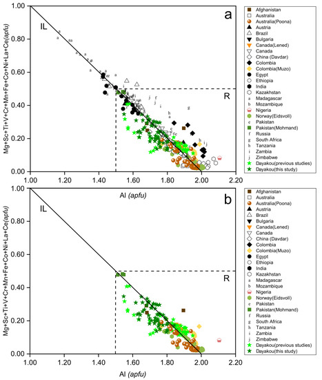 Al versus the sum of its substituents in Y site, in atoms per formula unit (apfu). (a) Plot of 54 Dayakou emerald compositions superimposed on 480 worldwide emerald compositions from literature. (b) Plot of emerald compositions from V-dominant deposits. Dotted rectangle area (R) indicates the Al occupancy is more than 75%. IL = ideal line defined by Al (Y site) = 2 apfu to Σ substituents = 1 apfu. Sources of data are the same as in Figure 3.