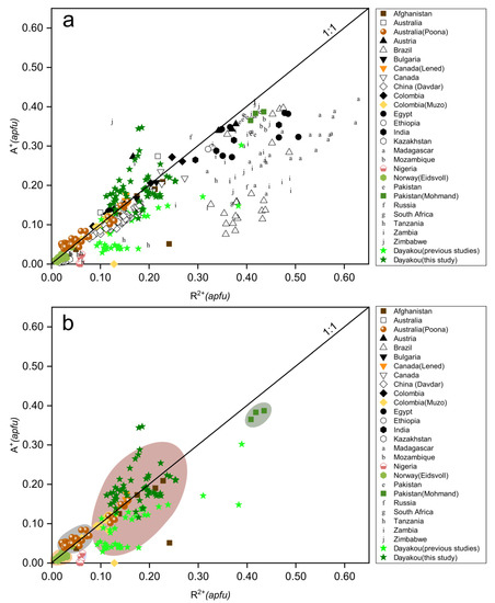 Plots of R2+ (divalent cations in octahedral site) versus A+ (monovalent alkali cations in channel). (a) Plot of 54 Dayakou emerald compositions superimposed on 480 worldwide emerald compositions from literature. (b) Plot of emerald compositions from V-dominant deposits. Data are normalized from wt.% microprobe analyses, with all Fe as FeO. Colored areas indicate discriminated clusters. They are clusters of Eidsvoll (yellow), Poona (gray), Dayakou + Muzo + Lened + Panjshir Valley (light red), and Mohmand (dark gray). Sources of data are the same as in Figure 3.