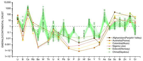 The bulk continental crust normalized [45] multi-element spider diagram of 34 Dayakou emerald samples (98 analyses) in this study compared to emeralds of other V-dominant deposits from literature. Data are expressed in ppm. Sources of data: [16,42].