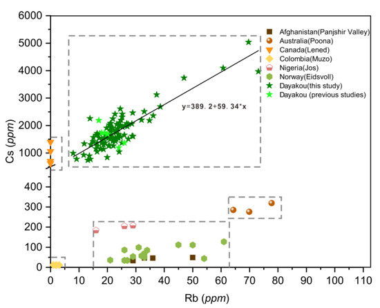 In the Rb versus Cs binary diagram (Figure 8), the Dayakou emerald shows an obvious positive linear correlation between the Rb and Cs, which can be expressed by the following equation: