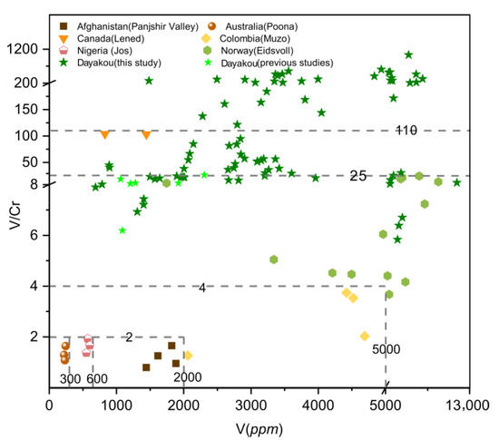 The V/Cr ratio is a common indicator of emerald. A plot of V/Cr ratio versus V (Figure 9) content can easily separate Muzo, Poona, Jos, and Panjshir Valley emeralds. These four deposits are plotted at the area with a V/Cr ratio of less than 4 and a V content of less than 5000 ppm. Emeralds from Muzo are clearly distinguished based on the higher content of V and V/Cr ratios (V ~5000 ppm, V/Cr > 2), and those from Poona, Jos, and Panjshir Valley can be separated by V content. The V/Cr ratios of the Eidsvoll emeralds are lower than 25, and those of Lened emeralds are approximately 100. Only some samples from Dayakou show a V/Cr ratio higher than 110.