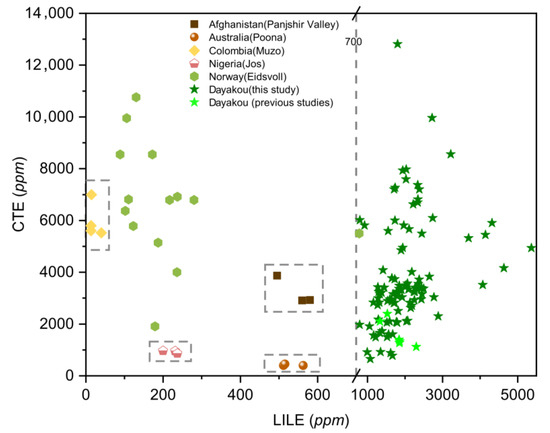 Large ion lithophile (LILE: Rb, Ba, K, Sr, Cs) elements are strongly incompatible elements. A plot of LILE versus CTE (Figure 10) displays the highest LILE content of the Dayakou emerald (>700 ppm) and the lowest content of the Muzo emerald (<50 ppm). The LILE contents of emeralds from both Panjshir Valley and Poona range from 450 to 600 ppm, but the CTE contents allow separating Panjshir Valley emeralds (2500 to 5000 ppm) from Poona emeralds (<1000 ppm). Eidsvoll emeralds display a wide range of CTE content.