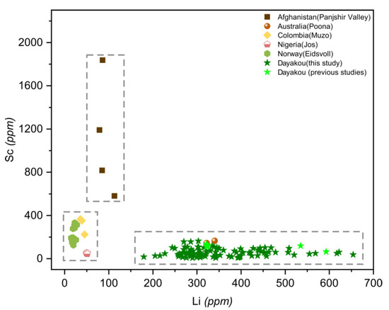 Plot of lithium (Li) versus scandium (Sc) concentrations in emeralds from six vanadium-dominant deposits. Data are expressed in ppm. Dotted rectangle highlight clusters of the distinctive deposits. Sources of data are the same as Figure 10.