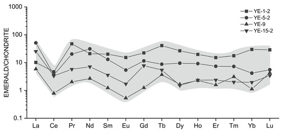 Representative chondrite-normalized rare earth element patterns of emeralds from Dayakou deposit. Normalization values after [47].