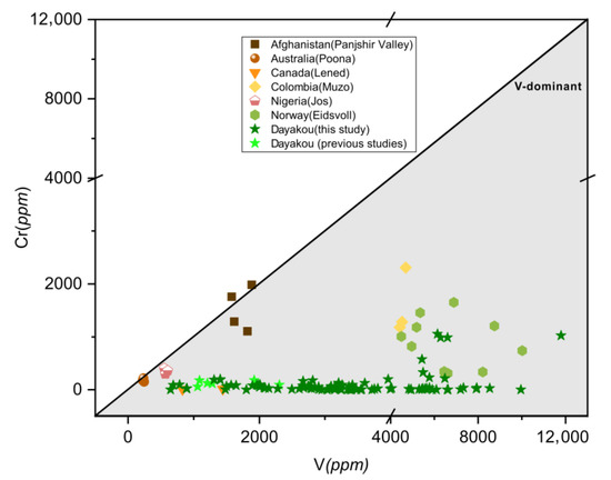 Plot of vanadium (V) versus chromium (Cr) concentrations (expressed in ppm) in emeralds from seven V-dominant deposits. Gray triangular area indicates the V-dominance. Sources of data: [46] (average of five analyses), [16,42] (average of three analyses).