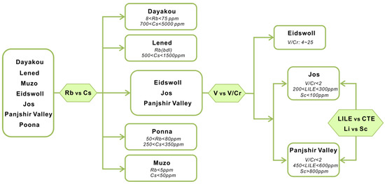 One of the feasible schemes to discriminate the origin of V-dominant emerald deposits is proposed in Figure 16. The plot of Rb vs. Cs (Figure 8) displays five distinct clusters which allow discriminating four deposits (Dayakou, Lened, Poona, and Muzo). The other indiscriminate cluster includes the Eidsvoll, Jos, and Panjshir Valley deposits. The plot of V vs. V/Cr (Figure 9) helps distinguish the Eidsvoll deposits from the other two. Plots of LILE vs. CTE (Figure 10) and Li vs. Sc (Figure 11) can easily differentiate the Jos and Panjshir Valley deposits.