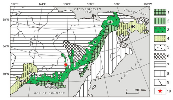 - Bogdanov, N.A.; Til’man, S.M. Tectonics and Geodynamics of North–East Asia: Explanatory Note to Tectonic Map of North-East Asia, 1:5,000,000 Scale; Institute of Lithosphere RAS: Moscow, Russia, 1992; p. 54. (In Russian) [Google Scholar]