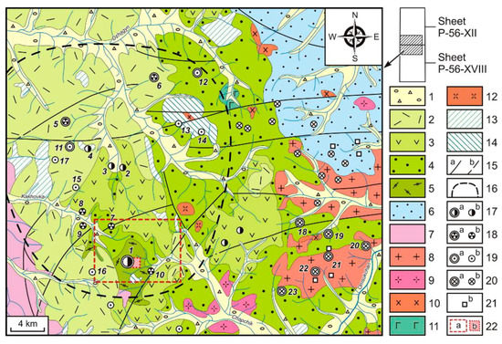 Schematic geological map of the Balygychan–Sugoy trough’s central part. Constructed by the authors of the present paper using the data from [72,73] with additions by [3] and materials of the Dukat geological exploration enterprise. 1—Quaternary sediments; 2—upper Cretaceous rhyolites, ignimbrites and rhyolitic tuffs (Shorokh suite); 3—lower–upper Cretaceous andesites, andesite–basalts, their tuffs and tuffaceous lavas, dacites, rhyolites, tuffaceous conglomerates and tuffaceous aleurolites (Kakhovka suite); 4—lower Cretaceous sandstones, aleurolites, argillites, conglomerates and coal seams (Omsukchan suite); 5—lower Cretaceous rhyolites, tuffaceous lavas and tuffs of rhyolites, felsites, andesites, dacites, tuffaceous conglomerates, sandstones, aleurolites and argillites (Askold suite); 6—Jurassic aleurolites, argillites, sandstones, tuffaceous sandstones, sandy argillites, tuffaceous gravelites and ash tuffs; 7—Triassic argillites, aleurolites, sandstones, sandy mudstones, tuffs, calcareous sandstones and coquinas; 8–11—late Cretaceous intrusions: 8—granites, 9—granodiorites, 10—diorites, quartz diorites and diorite porphyrites and 11—gabbro; 12—early Cretaceous diorite porphyrites; 13 and 14—subvolcanic formations: 13—late Cretaceous rhyolites, nevadites, felsites, andesites, diorite porphyrites and diorites and 14—early Cretaceous rhyolites; 15—faults: a—reliable, b—estimated; 16—the boundaries of the Dukat Au–Ag OFS; 17–21—deposits (a) and prospects (b): 17—gold–silver (1—Dukat, 2—Krasin, 3—Barguzin and 4—Zharok), 18—silver–polymetallic (5—Mechta, 6—Tidid, 7—Nachalny, 8—Struya, 9—Yasnaya Polyana and 10—Fakel), 19—tin–silver (11—Maly Ken, 12—Novo-Dzhagyn, 13—Razny, 14—Finalny, 15—Severny, 16—Shorokh and 17—Tovarishch), 20—tin (18—Upper Bastoy, 19—Chuzhoye, 20—Vengerka, 21—Khataren, 22—Industrialnoye and 23—Nimfa), 21—tin–rare metal and rare metal; 22—area of geochemical survey of lithochemical stream sediments of 1:50,000 scale (a); Chaika site, where the detailed work was carried out, including bryolithochemical research, and the alluvium material composition study (b).