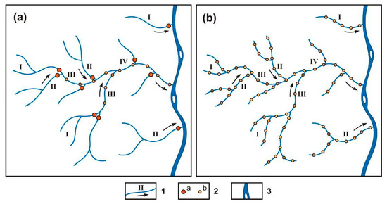 A theoretical sampling scheme of 1:200,000 (a) and 1:50,000 (b) scale lithochemical stream sediments (LSS) surveys shown on a conventional map of the drainage system. 1—watercourses (blue lines), their order (Roman numerals) and their runoff direction (arrows); 2—sampling points (a—double; b—ordinary); and 3—the main river. Note: The actual alluvium sampling places of the LSS surveys on the 1:200,000 and 1:50,000 scales discussed in the present paper are shown in Figure 4.
