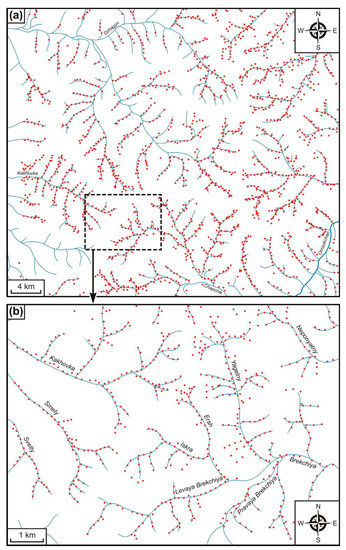 The alluvium samples’ location (red points) in the survey of LSSs on the 1:200,000 (a) and 1:50,000 (b) scales.