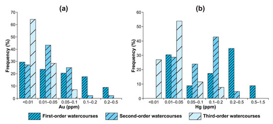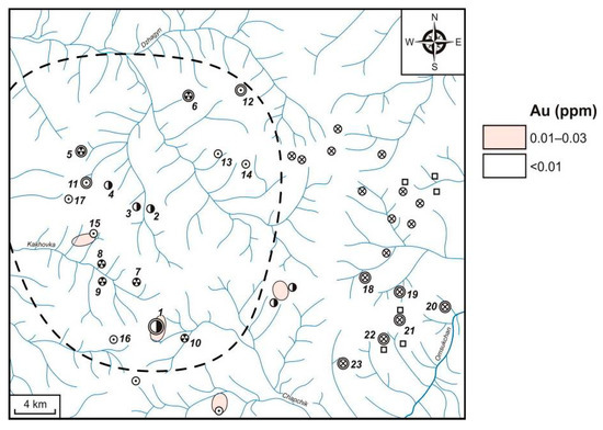 All the areal geochemical surveys of LSSs were performed according to standard techniques [16,85]. Systematic lithochemical point sampling was carried out from loose alluvial sediments of actual watercourses (Figure 3).