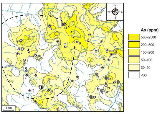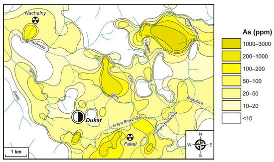 In general, it can be seen that the As fields’ contrast in LSSs of deposits, prospects, and “ore-free” areas varies widely. The main factors affecting the As distribution, most probably, are the morphology of ore bodies and differences in their mineral composition. For example, exogenous AGFs of Au–Ag deposits and prospects, especially of such a giant as the Dukat Au–Ag deposit, are characterized by relatively low As contents. Ores belong to the vein type. Arsenic minerals are represented in them in a small quantity, mostly by sulphoarsenides (proustite and tennantite). These minerals are extremely unstable in hypergene environments. Entering watercourses, they are destroyed, part of the As transits into mobile water-soluble forms and is transported relatively short distances and the high-contrast fields are not formed.
