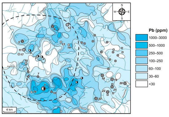 Attention should be paid to the fact that the contrast of the fields related to some Au–Ag, Ag–Pb and even Sn–Ag prospects is higher than in the Mechta Ag–Pb deposit. This situation can be caused by a number of factors, such as the branching of the drainage system, the ore bodies’ morphology, their position in relation to the draining streams and the sod cover of the watercourse heads (a barrier to the material transfer). In addition, the low contents, to some extent, reflect the level of the ore zones’ erosion profile. For example, the upper ore intervals of Ag–Pb mineralization are not characteristic of high Pb content. In general, it can be seen that fields with Pb contents greater than 100 ppm (CR > 10) are confined to Au–Ag and Ag–Pb and rarely occur with Sn–Ag deposits and prospects. The relationship of contrast (CR = 10–100) and high-contrast (CR = 100–300) Pb AGFs with different ore objects is due to the fact that, in the series of vertical endogenous geochemical zonality, Ag–Pb mineralization takes an intermediate place between Au–Ag and Sn–Ag mineralization [56]. During the erosion of low ore horizons of Au–Ag ore objects and upper ore horizons of Sn–Ag ore objects by watercourses, the Ag–Pb ores will inevitably be affected.