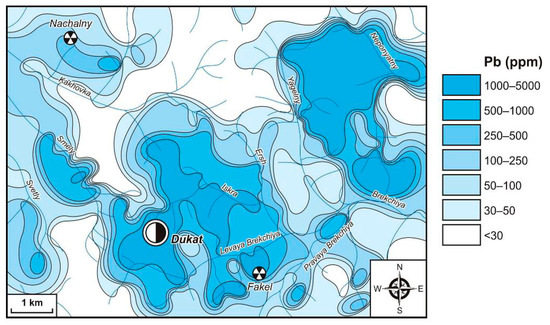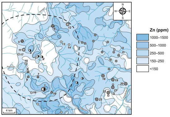 Zinc is widely manifested throughout the study area (Figure 9). Medium-contrast fields with contents of 500–1500 ppm (CR = 10–30) are developed, mainly in the southern part of the Dukat OFS and along the periphery to the north–east and south-east of it. Within the Dukat OFS, such fields tend to be attracted to Au–Ag (Dukat, Barguzin and Zharok) and Ag–Pb (Tidid and Fakel) deposits and prospects. Outside the system, exogenous Zn AGFs are related to a number of Au–Ag, Sn–Ag, and Sn prospects. Low-contrast fields with concentrations of 150–500 ppm and CR = 3–10 have maximum prevalence. They are identified both within the Dukat OFS and beyond it. Such AGFs are related to different ore objects. Most parts of the low-contrast Zn anomalies, as well as Pb, have no relation to deposits and prospects but are associated with unprofitable ZDSM.