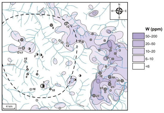 Tungsten in LSSs is spread mainly outside the Dukat OFS (Figure 12). The most significant fields (10–200 ppm, CR = 5–100) of W anomalous concentrations in terms of size and contrast are attracted to the area located to the east of the Dukat Au–Ag OFS. They are related here to numerous Sn, Sn–W and Mo–W deposits and prospects. The Dukat OFS is characterized by low-contrast W AGFs. These element concentrations do not exceed 10 ppm (CR<5) and were identified in the watercourse alluvium draining different ore objects—Au–Ag (Dukat and Zharok), Ag–Pb (Mechta) and Sn–Ag (Maly Ken, Novo-Dzhagyn and Razny). W anomalies’ contrast increases slightly (10–20 ppm, CR = 5–10) only towards the north–eastern border of the Dukat OFS, where the Finalny Sn–Ag prospect is located.