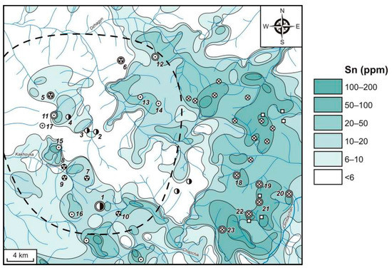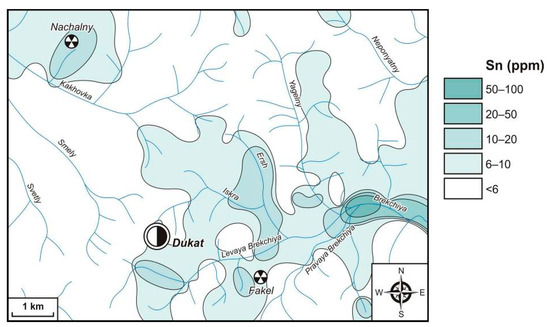 Tin in the considered territory is characterized by quite wide development of AGFs (Figure 13). The exogenous Sn AGFs with the most contrast (50–200 ppm, CR = 25–100), as well as those for W, are observed outside the Dukat OFS. Such anomalies clearly fix Sn–Ag, Sn, Sn–W and Mo–W ore objects. Here, lower-contrast anomalies (<50 ppm, CR < 25) are the most developed. Within the Dukat Au–Ag OFS, the Sn contents reach 50–100 ppm (CR = 25–50) only in single anomalies. Such anomalous concentration fields are confined to the Severny Sn–Ag prospect and to the eastern flank of the Dukat Au–Ag deposit. Fields of less contrast (20–50 ppm, CR = 10–25) are revealed by the watercourse LSSs draining mainly Sn–Ag objects (Maly Ken and Novo-Dzhagyn deposits and Razny, Finalny and Shorokh prospects). To a lesser extent, such fields are manifested in Au–Ag (Dukat) and Ag–Pb (Fakel) deposits and prospects and on the flanks of the Dukat, where Sn–Ag mineralization was also observed. In general, for exogenous Sn AGFs within the Dukat Au–Ag OFS, the low contrast (6–20 ppm, CR = 3–10) is characteristic.
