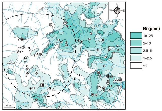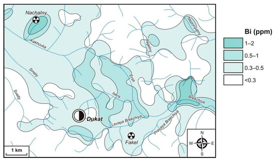 Bismuth forms exogenous AGFs (Figure 14) that are significant in size and contrast. Low-contrast Bi fields (CR < 10) are not considered here due to the poor Bi detection limit of the SSQA method (1 ppm). The highest-contrast Bi AGFs (5–25 ppm, CR = 50–250) in the area of the Dukat Au–Ag OFS are located near the north–eastern border. They are confined mainly to the Sn–Ag objects—the Novo-Dzhagyn deposit and the Razny and Finalny prospects. In addition, fields of such contrast were identified in sites where ore objects are not known. Sn–Ag objects of the Dukat OFS’s western part (Maly Ken deposit and Tovarishch, Severny and Shorokh prospects) are characterized by significantly lower-contrast Bi fields (<2.5 ppm, CR < 25). The same fields are related to Au–Ag and Ag–Pb objects. The only exception is the Mechta Ag–Pb deposit, in which the Bi concentrations in LSSs reach 10 ppm (CR = 100). Outside the Dukat OFS, the Bi fields of anomalous concentrations are widely developed and confined to Sn, Sn–W, Mo–W and (in the south) Sn–Ag objects. The maximum anomalous fields with the content of 5–25 ppm (CR = 50–250) are more prevalent here than within the Dukat OFS.