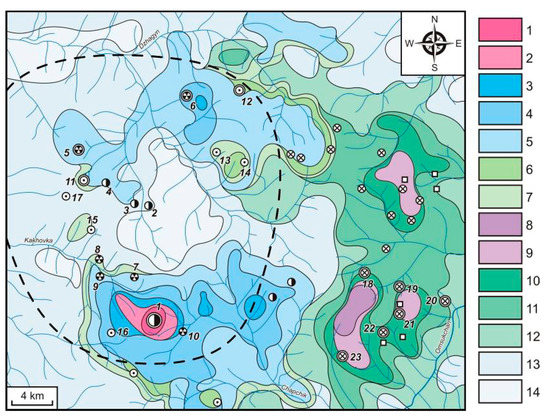 The Dukat Au–Ag OFS and associated areas. Exogenous polyelement AGFs identified through LSSs (survey on the 1:200,000 scale). 1–14—geochemical associations of ore elements (see Table 2): 1 and 2—predominantly Ag; 3–5—Ag–Pb; 6 and 7—Sn–Ag; 8 and 9—Mo–W and Sn–W; 10–12—Sn; and 13 and 14—Pb–Zn in ZDSM. For the legend to Figure 15 see Figure 2 (Section 2.2).