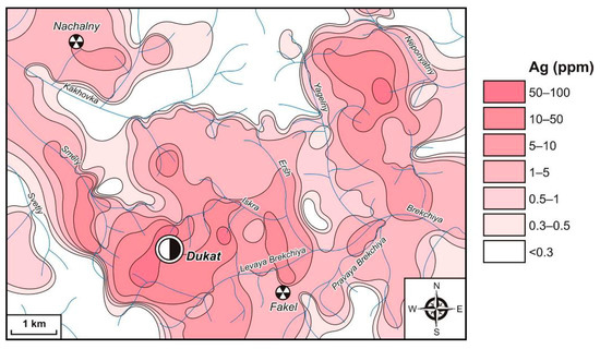 Silver is the most widely manifested element in the entire studied area (Figure 6). This supports the unique metallogenic specialization of the considered territory as well as all of the OCVB outer zone for silver. Au–Ag, Ag–Pb and Sn–Ag ore objects located within the boundaries of the Dukat Au–Ag OFS and beyond this distinctly fix AGFs of high (10–30 ppm, CR = 100–300) and medium (1–10 ppm, CR = 10–100) Ag contrast. The maximum content of this element in the exogenous AGFs identified through LSSs is 5–30 ppm (CR = 50–300). These fields are related to the largest of the silver Au–Ag reserves in the Dukat deposit. Anomalies with content of 1–5 ppm (CR = 10–50) were identified in a circumferential direction of this deposit and in the areas of Au–Ag (Zharok), Ag–Pb (Fakel) and Sn–Ag (Shorokh and Finalny) prospects as well as the Ag–Pb deposits (Mechta and Tidid). Outside the Dukat OFS, such fields fix a number of Au–Ag and Sn–Ag prospects. They are partly manifested in the development area of the Sn ore objects. Low-contrast (0.3–1 ppm, CR = 3–10) Ag AGFs have the widest development.