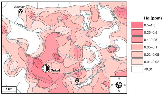 Mercury, while conducting areal LSS surveys on the 1:200,000 scale, was analyzed through the traditional method of SSQA. We used a sample-spilling method on the spectrograph STE-1 with USA-5 attachment, and this element’s detection limit was 1 ppm. Later, during areal LSS surveys on the 1:50,000 scale and detailed research, the atomic absorption method with acid decomposition was used with the techniques in [90,91]. The measurements were carried out on an atomic absorption spectrophotometer RAF-1M (Kazgeofizpribor, Kazan, Russia) and afterwards the mercury analyzer RA-915+ with the attachment RP-91S (Lumex, Saint Petersburg, Russia), the element detection limit in both cases being 0.005 ppm. Low Hg contents were analyzed using the atomic fluorescence method [92]. An atomic fluorescence spectrometer PSA 10.003 (P.S. Analytical, Orpington, UK) with a hydride generator was used for the measurements. The Hg detection limit was 0.0002 ppm.