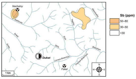 - Kravtsova, R.G.; Makshakov, A.S. Stream sediments of gold–silver ore-forming systems (Balygychan–Sugoisk depression, Northeast of Russia). In Gold of the North Pacific Rim, Proceedings of the Geology & Mining Conference and II International Geology & Mining Forum dedicated to Yu. A. Bilibin’s 110th anniversary, Magadan, Russia, 3–5 September 2011; Goryachev, N.A., Ed.; NEISRI FEB RAS: Magadan, Russia, 2011; pp. 249–250. [Google Scholar]