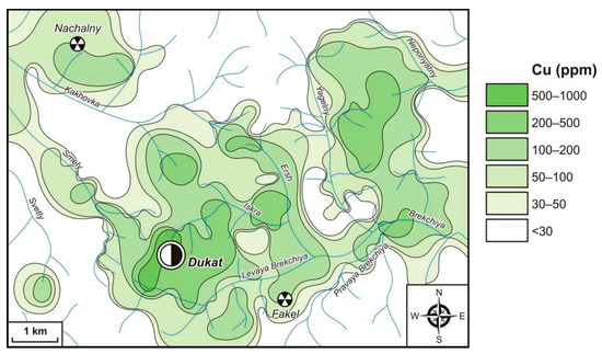 Copper is manifested in the form of low-contrast AGFs throughout the territory (30–100 ppm, CR = 3–10), and medium-contrast AGFs are rarer (100–200 ppm, CR = 10–20) (Figure 10). Their main part is concentrated in the east of the Dukat OFS and is confined to the development areas of Sn, Sn–W and Mo–W mineralization. Within the Dukat OFS, anomalies with Cu content of 50–100 ppm (CR = 5–10) are attracted to its eastern edge. They are related to the Dukat Au–Ag deposit, to its flanks and to the Finalny Sn–Ag prospect. Lower-contrast fields (30–50 ppm, CR = 3–5) are developed much more widely. They are confined to the Au–Ag (Zharok prospect), Ag–Pb (Fakel prospect), and Sn–Ag (Maly Ken and Novo-Dzhagyn deposits and Razny and Severny prospects) objects.