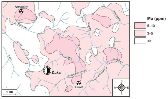 Molybdenum in the considered area forms rare local fields of medium contrast (10–30 ppm, CR = 10–30) and wide low-contrast AGFs (3–10 ppm, CR = 3–10) (Figure 11). Anomalies of medium contrast are manifested only outside the Dukat OFS and attract to Sn, Sn–W and Mo–W objects. Low-contrast AGFs are identified both within the Dukat OFS and outside it in the eastern part of the area. Such fields attract objects of all known types of mineralization.