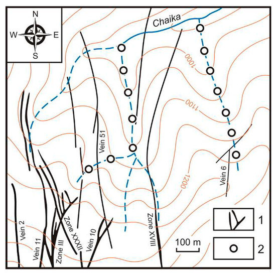 - Natalenko, V.E.; Kalinin, A.I.; Raevskaya, I.S.; Tolstikhin, Y.V.; Khalkhalov, Y.A.; Bel’kov, E.V. Geological setting of Dukat deposit. In Materials on Geology and Mineral Resources of North–East USSR; Book Publishing House: Magadan, Russia, 1980; Issue 25, pp. 61–73. (In Russian) [Google Scholar]