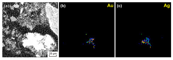 Substance composition determination was performed through local analysis methods using electron probe microanalysis (EPMA) on the JXA-8200 SuperProbe (JEOL Ltd., Tokyo, Japan) microanalyzer in accordance with the available techniques [93,94,95,96]. Grain surfaces were examined through a scanning electron microscope JXA-8200 SuperProbe (JEOL Ltd., Tokyo, Japan) with backscattered and secondary electrons to detect inclusions containing ore elements. With the help of an energy dispersive spectrometer EX-84055MU (JEOL Ltd., Tokyo, Japan), the inclusion compositions found were identified. The elements’ content change on the surface was studied on the distribution maps of the elements’ X-ray radiation obtained using wave spectrometers. The chemical composition of the inclusions found was determined by the survey monitoring and recalculating the recorded relative intensities in the concentration using the JXA-8200 SuperProbe microanalyzer software (Version 01.42, JEOL Ltd., Tokyo, Japan). In determining the composition of finely dispersed gold inclusions with a size smaller than the locality of the EPMA method, matrix effects were taken into account following the method of content trends [95,96].