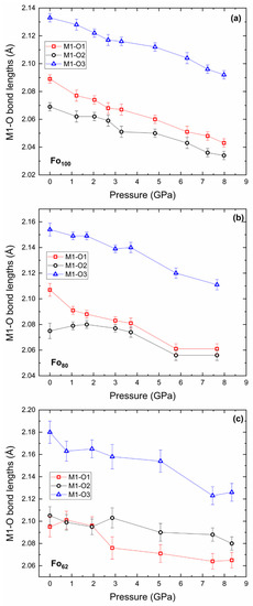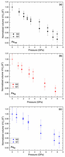 The volume distortions of the M2 and M1 polyhedra were calculated using the IVTON software [32] as [Vi − Vp]/Vi, where Vi is the volume of the ideal polyhedron and Vp the volume of the coordination polyhedron. These data are reported in Table S1. In general, the M1 polyhedron in olivine is smaller and more distorted than the M2 [5,6]. However, at room pressure, the M2 and M1 octahedra showed an almost identical distortion for Fo100 and Fo80. In contrast, both the M2 and M1 octahedra in Fo62 were more distorted (between 18% and 25%) when compared to Fo100 and Fo80. This behaviour may explain the compressibility change toward higher bulk moduli in more Fe-rich compositions. Instead, the Si tetrahedron was again the most regular, regardless of the composition considered.